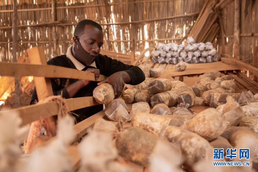 9月9日,在盧旺達首都基加利,埃馬紐埃爾·阿希馬納檢查菌袋。新華社發(fā)(西里爾·恩德格亞攝)