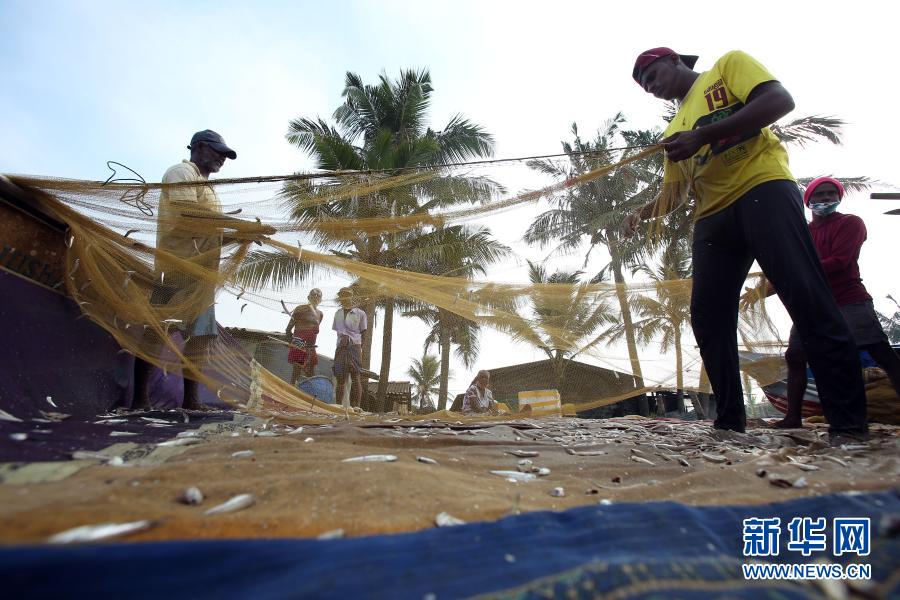 12月12日,在斯里蘭卡首都科倫坡附近的莫勒?qǐng)D沃,漁民在海邊整理漁網(wǎng)。