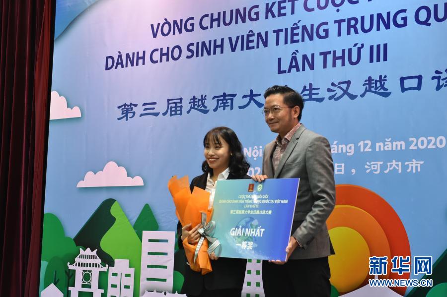 12月13日,在越南首都河內(nèi)舉行的第三屆越南大學(xué)生漢越口譯大賽決賽現(xiàn)場,冠軍阮氏明書(左)接受頒獎。新華社記者 蔣聲雄 攝