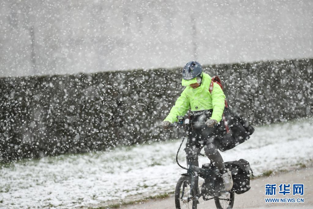 4月6日,一名市民在比利時(shí)布魯塞爾五十周年紀(jì)念公園冒雪騎車(chē)。