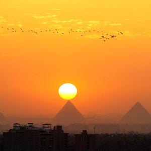 這是4月14日從埃及開羅拍攝的吉薩金字塔群日落景色。新華社記者 王東震 攝