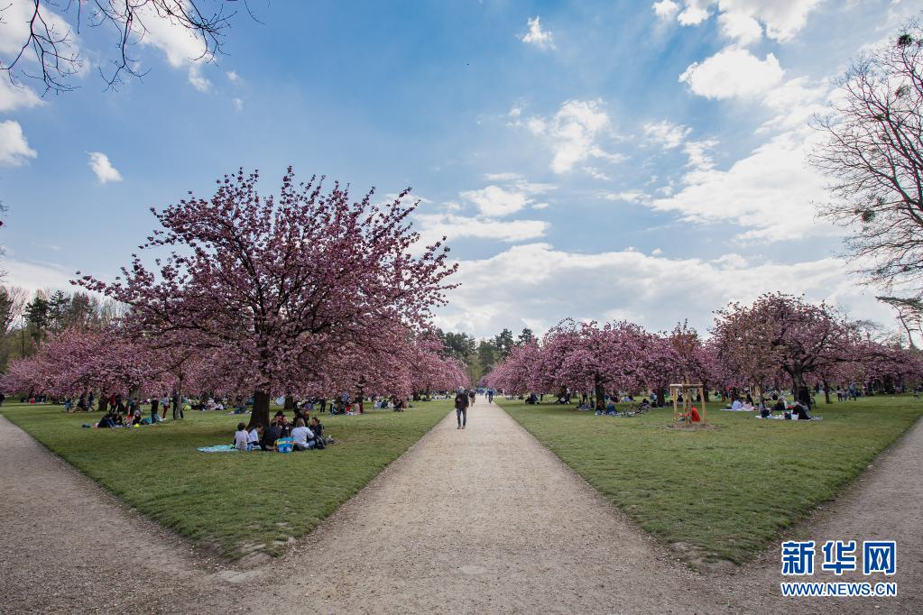 4月20日,人們?cè)诜▏屠杞嫉膰t公園欣賞櫻花。