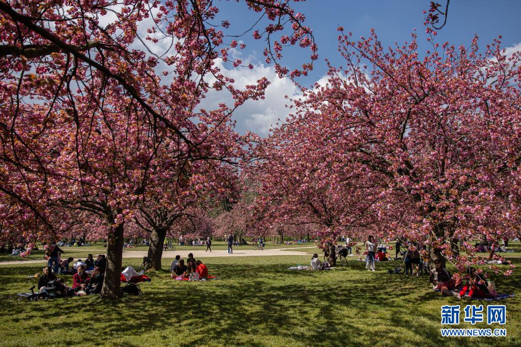 4月20日,人們?cè)诜▏屠杞嫉膰t公園欣賞櫻花。