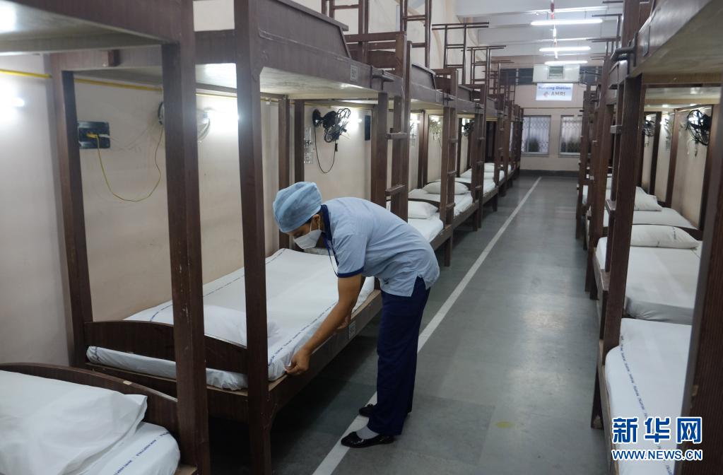 5月6日,工作人員在印度加爾各答一處被改造成新冠隔離中心的足球場內(nèi)整理床鋪。