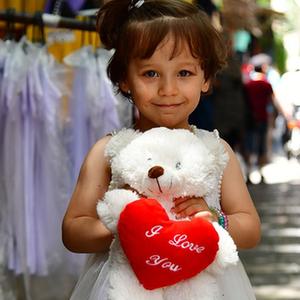 5月11日,一名女孩在敘利亞首都大馬士革的市場上抱著剛剛買到的玩偶。