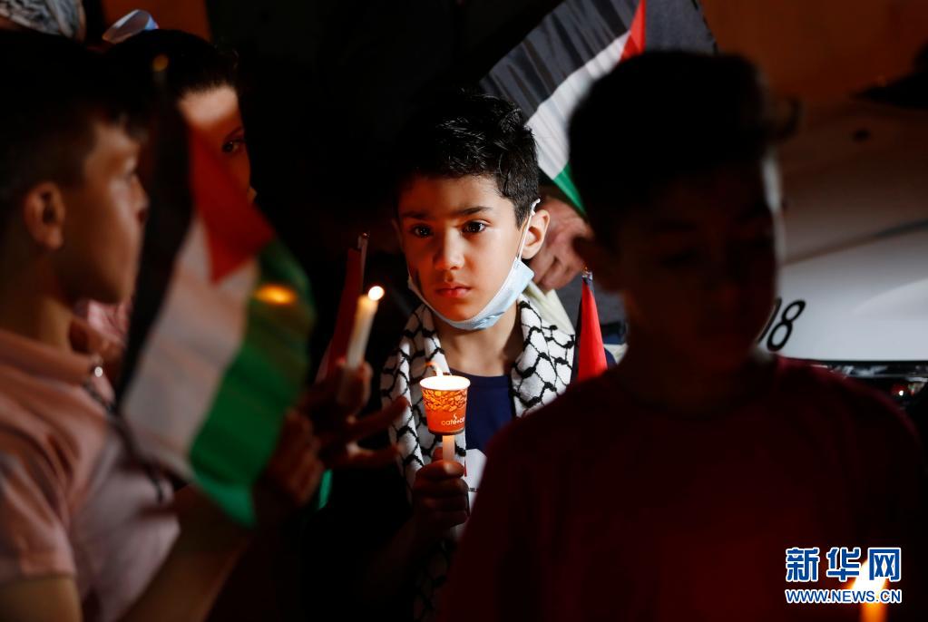 5月20日,一名兒童在約旦河西岸城市納布盧斯參加聲援活動。