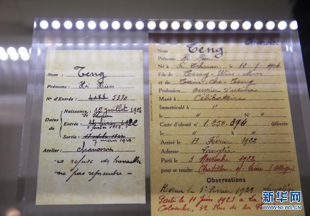 這是2021年3月22日在中國旅法勤工儉學(xué)蒙達爾紀紀念館拍攝的鄧小平當年在法國的居留登記卡和工作檔案卡。新華社記者 高靜 攝
