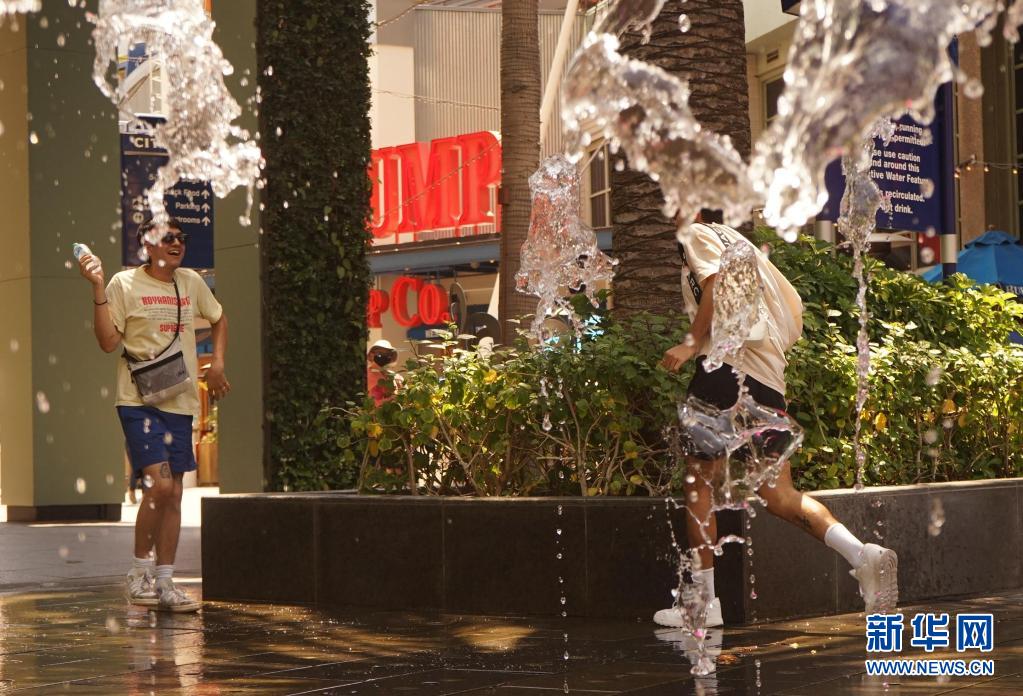 6月16日,美國(guó)加利福尼亞州洛杉磯市民在噴泉旁戲水納涼。加州南部本周迎來今年的首次高溫天氣。