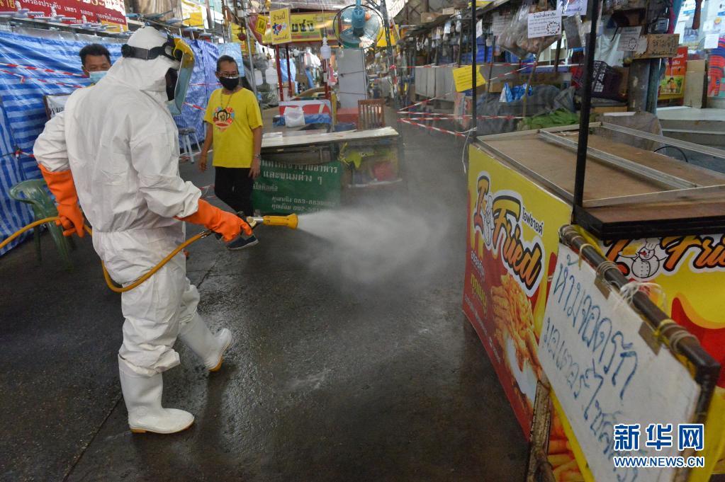 6月21日,工作人員在泰國(guó)首都曼谷一處生鮮市場(chǎng)進(jìn)行消毒。