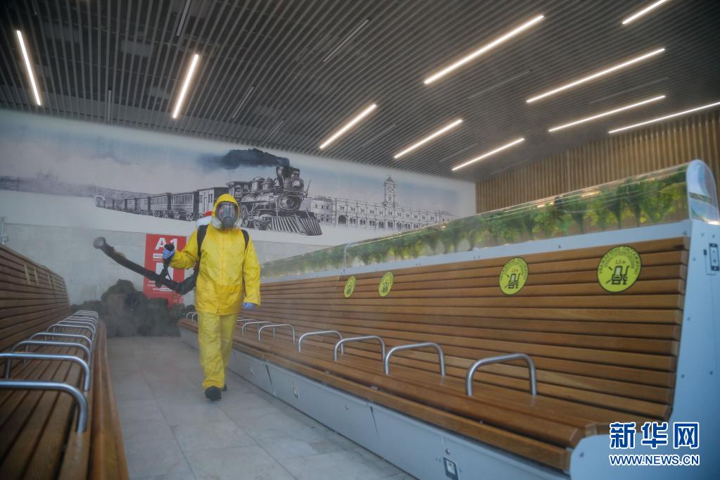 6月24日,工作人員身著防護服在俄羅斯莫斯科一個火車站進行消毒作業(yè)。