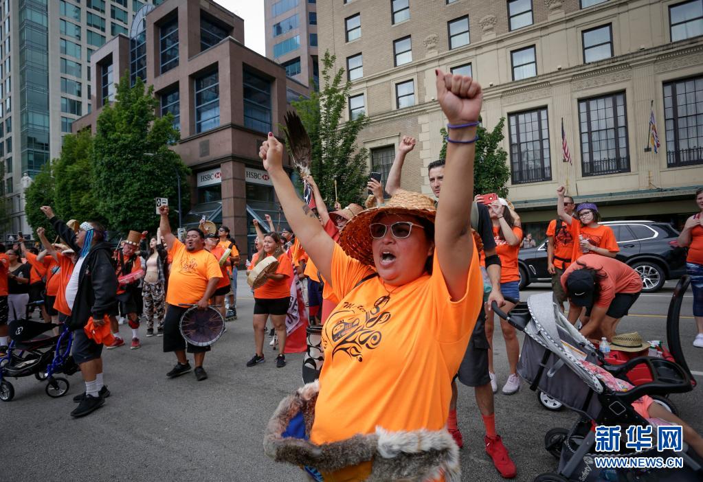 當(dāng)天是加拿大日,上千名抗議者在溫哥華集會,悼念加拿大在強(qiáng)制“同化”原住民過程中遭到殘害的兒童,呼吁取消加拿大日的慶祝活動。
