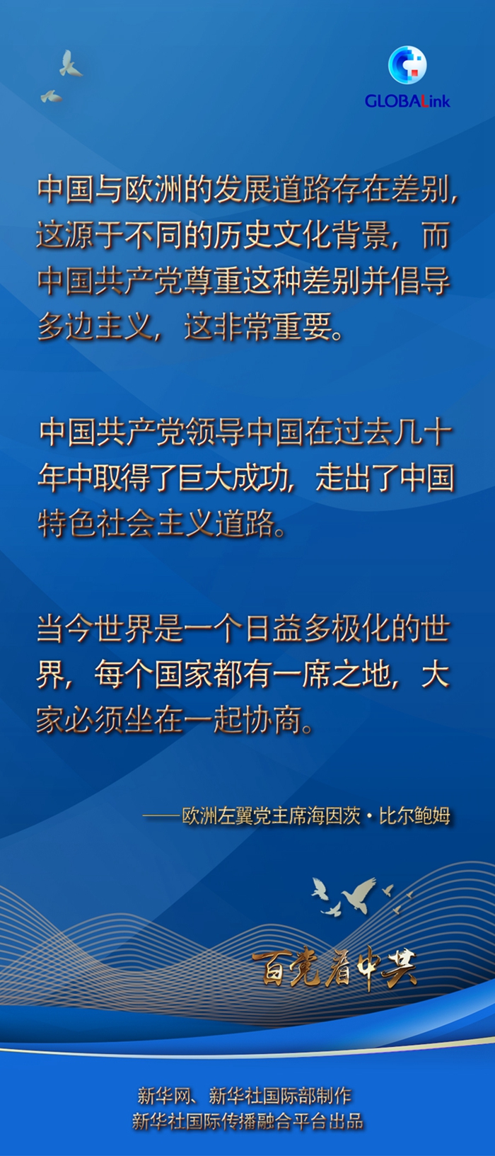 新華社布魯塞爾7月4日電 歐洲左翼黨主席海因茨·比爾鮑姆日前在接受中國媒體聯(lián)合采訪時表示,中國與歐洲的發(fā)展道路存在差別,這源于不同的歷史文化背景,而中國共產(chǎn)黨尊重這種差別并倡導(dǎo)多邊主義,這非常重要。