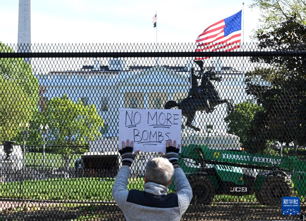 4月7日,一名示威者在美国首都华盛顿的白宫前手举标语。新华社记者 李睿 摄